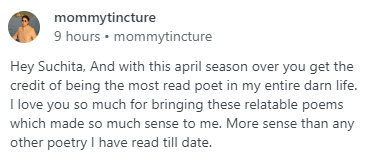 I was in for a surprise of a lifetime when I saw my ebook as a post on Lehaโs Instagram. And then I came to know she had written an entire blogpost on my ebook. There is a paragraph in her review which is made up of the titles of the poems in the ebook which is my favourite: